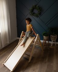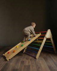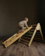 This extra large climbing triangle paired with a reversible rock ramp fosters imaginative, cooperative play for children in pairs or groups. Its minimalist design invites endless creative possibilities, transforming any space into an adventure playground. When not in use, the set adds a warm, elegant touch to your room. Each piece is meticulously handcrafted from FSC/PEFC-certified sustainable wood, complies with ASTM F963-17 safety standards, and is finished with water-based protective lacquer and paints.