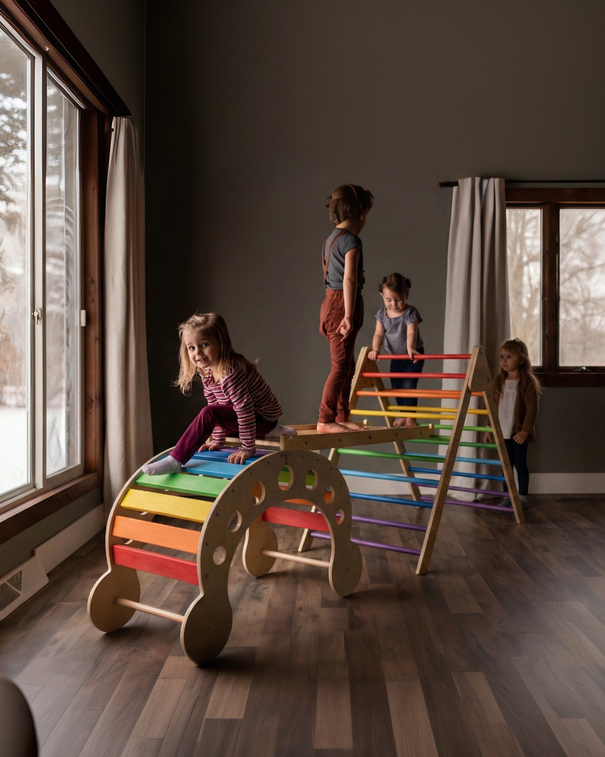 The Cassarokids Jumbo Waldorf Climbing Playset is the ultimate indoor activity center for active toddlers. This comprehensive 3-piece set includes a jumbo foldable climbing triangle, a jumbo Waldorf rocker, and a reversible rock climbing ramp that doubles as a smooth slide. Hand-crafted from 100% sustainable Birch and Beech wood, each piece can be used individually or connected to create custom obstacle courses.
