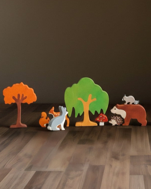 This 15-piece Waldorf collection features beloved woodland animals such as a fox, wolf, squirrel, badger, hedgehog, brown bear, moose, rabbit, raccoon, and deer, accompanied by a maple tree, conifer tree, oak tree, hickory tree, and a mushroom.