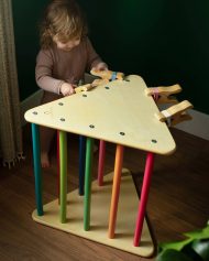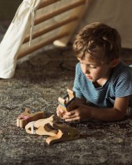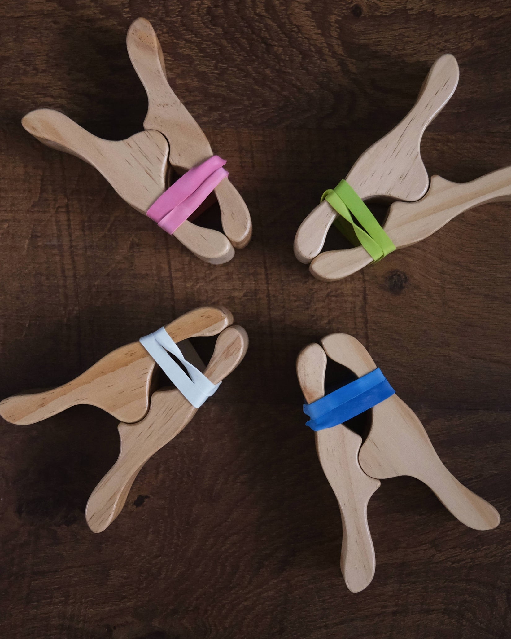 Crafted from natural oak wood, these clips offer a lightweight and smooth feel while maintaining robust durability for energetic play. Ideal for constructing blanket forts, securing fabrics on play stands, or imaginative activities such as dinosaur and robot hands, each set contains four clips with multicolored rubber bands plus eight extra bands for extended creativity.