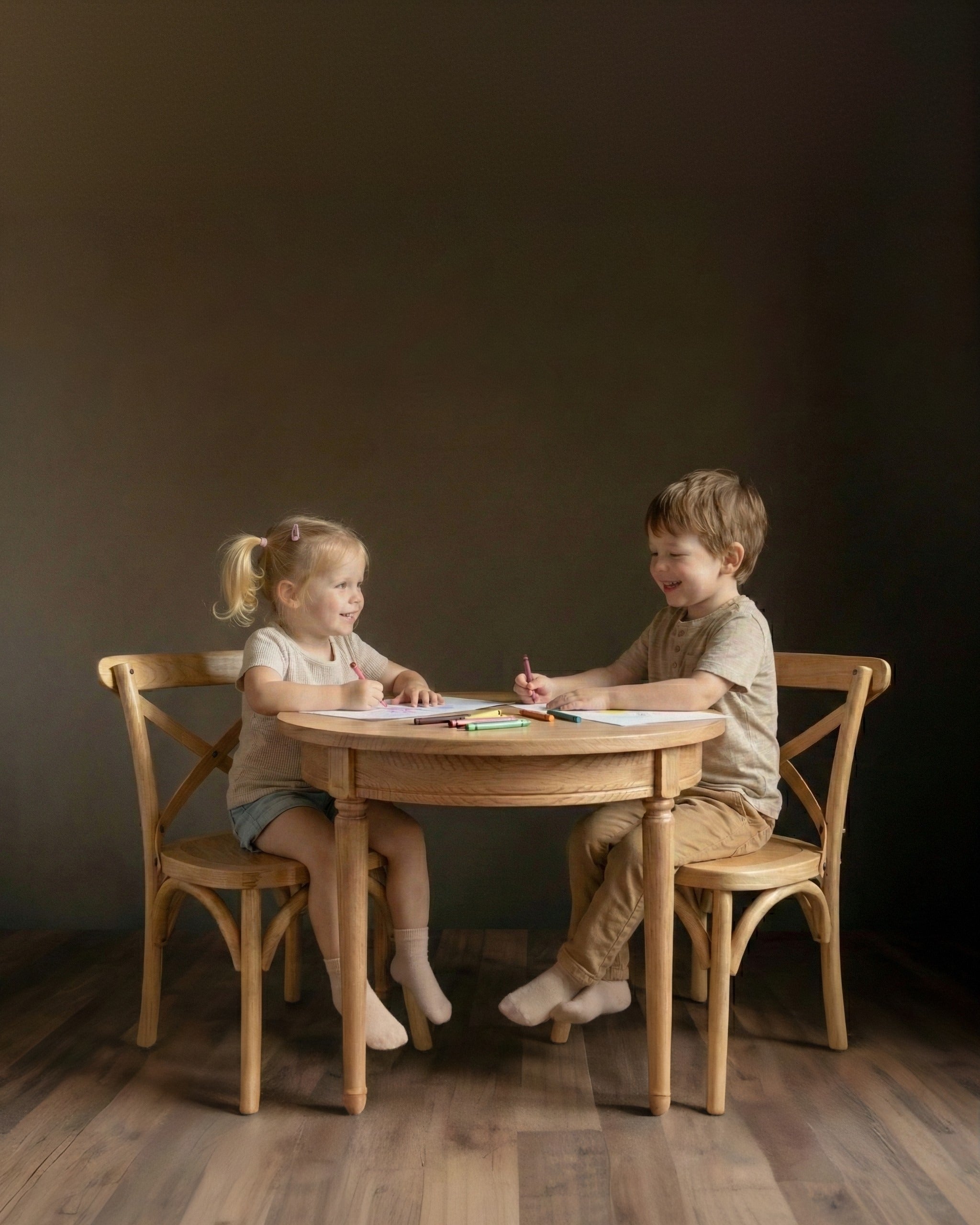 Elevate your child’s play space with the exquisite Genevieve Play Table & Chair Set. Crafted from high-end French oak, this set combines timeless elegance with heirloom-quality durability. The classic French cross-back chairs and a beautifully turned pedestal table create a sophisticated yet inviting spot for tea parties, crafts, and creative play.