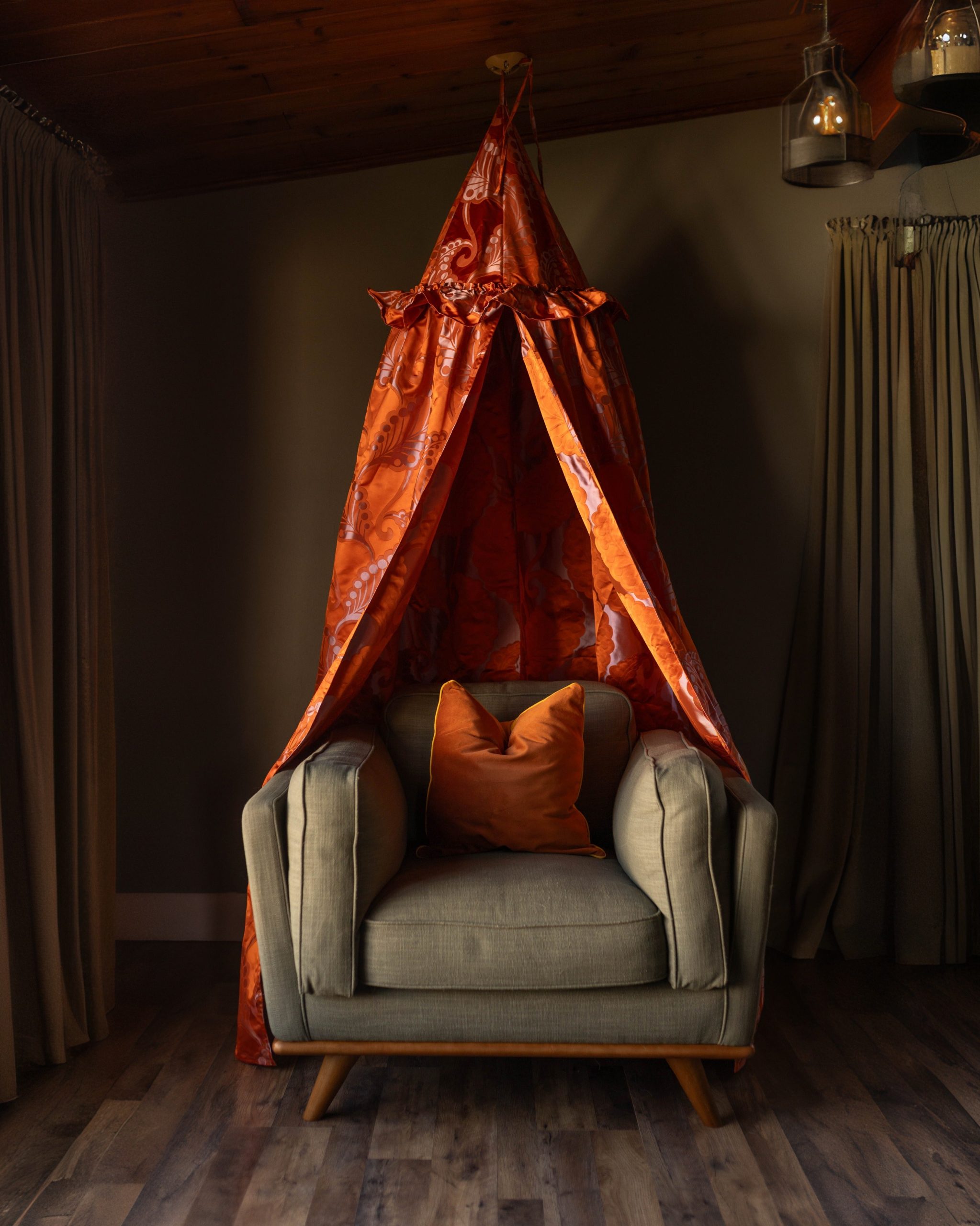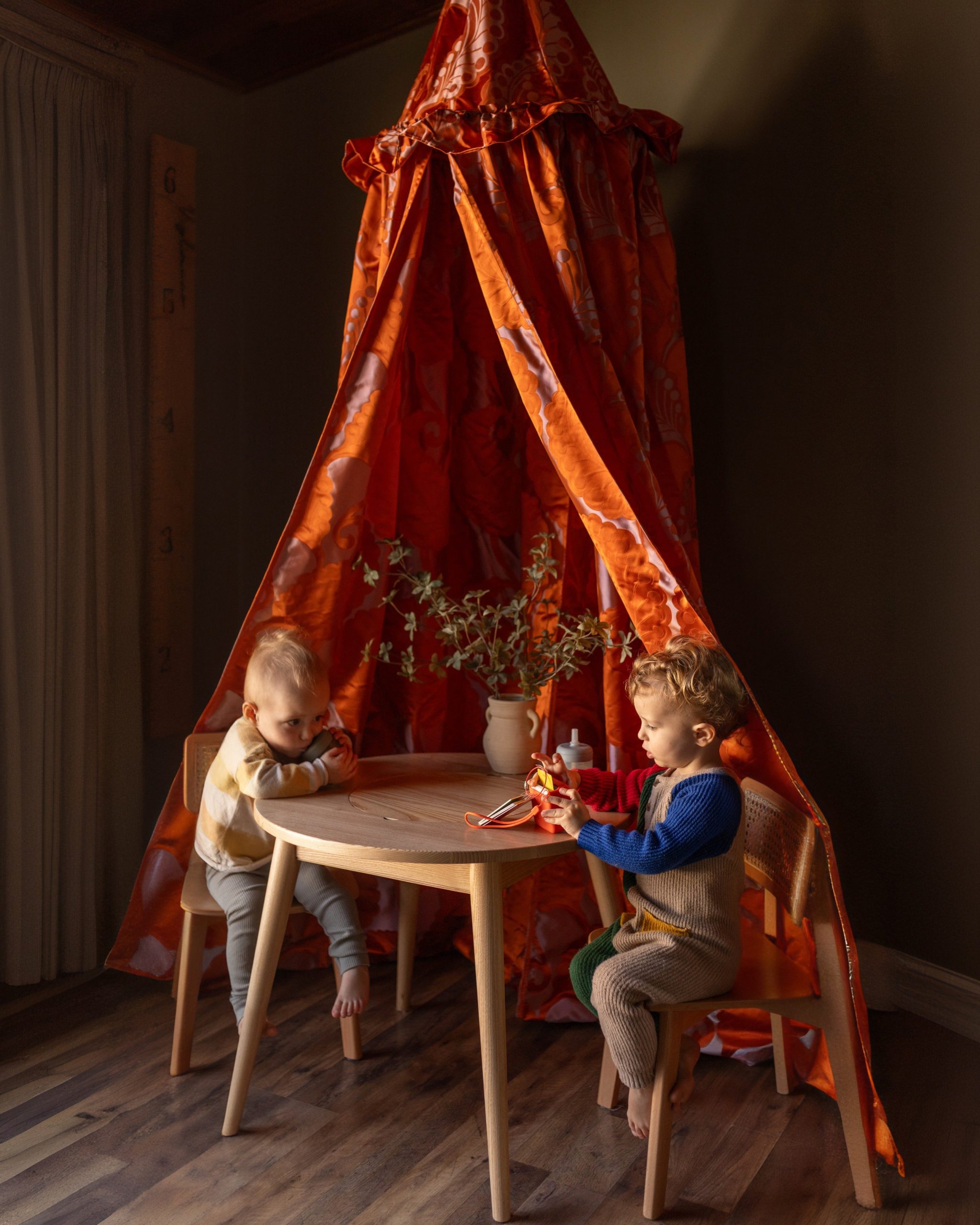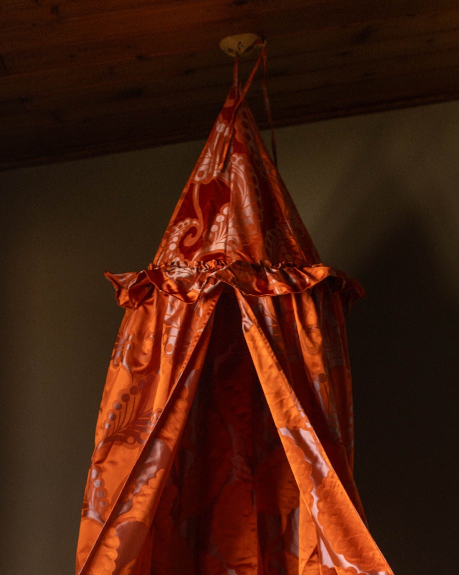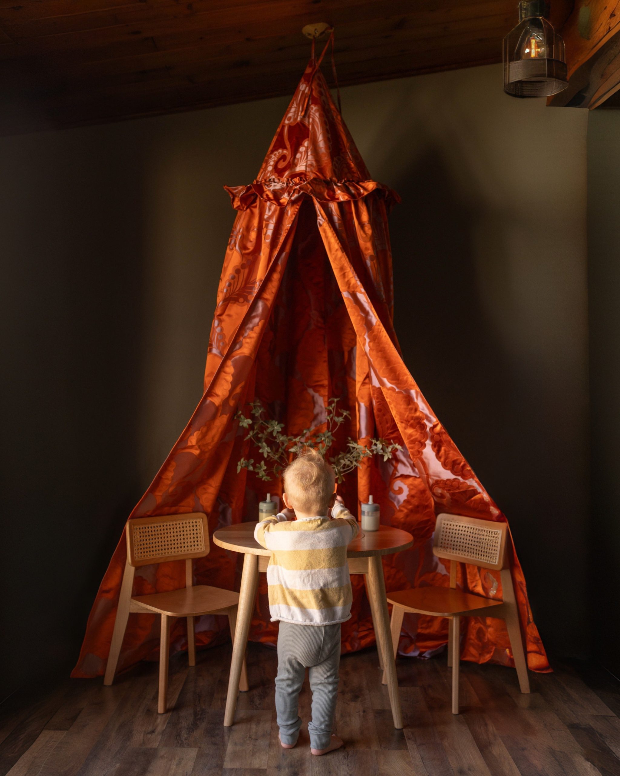 The Helene canopy features a vibrant orange hue, adorned with a delicate, intricate paisley pattern in a soft, contrasting shade. This timeless design brings a touch of sophisticated whimsy, perfectly complementing a high-end children’s interior. Whether it’s a quiet nook for reading and dreaming, a secret hideaway for imaginative play, or a stylish focal point in a curated playroom, the Helene canopy invites endless possibilities.