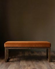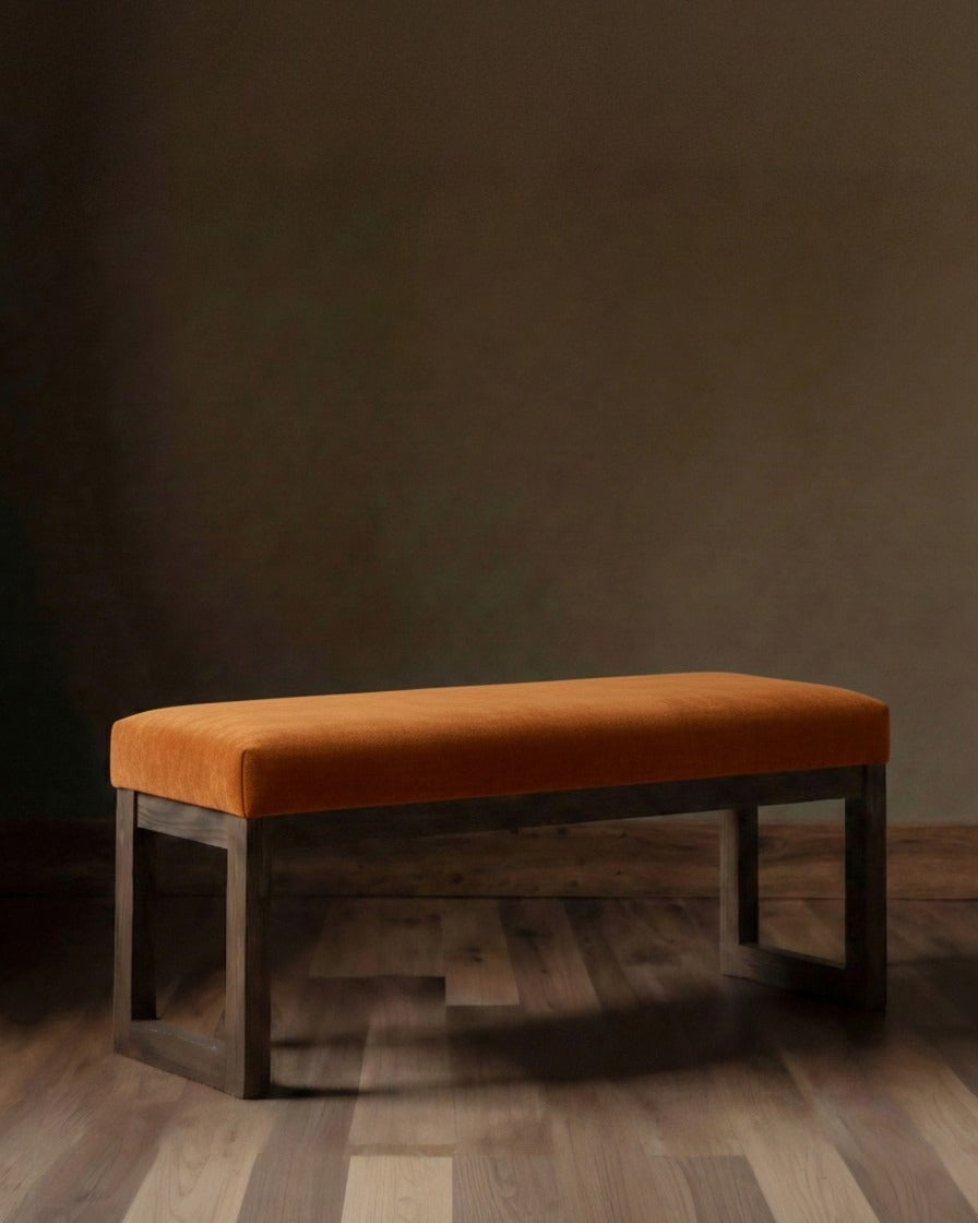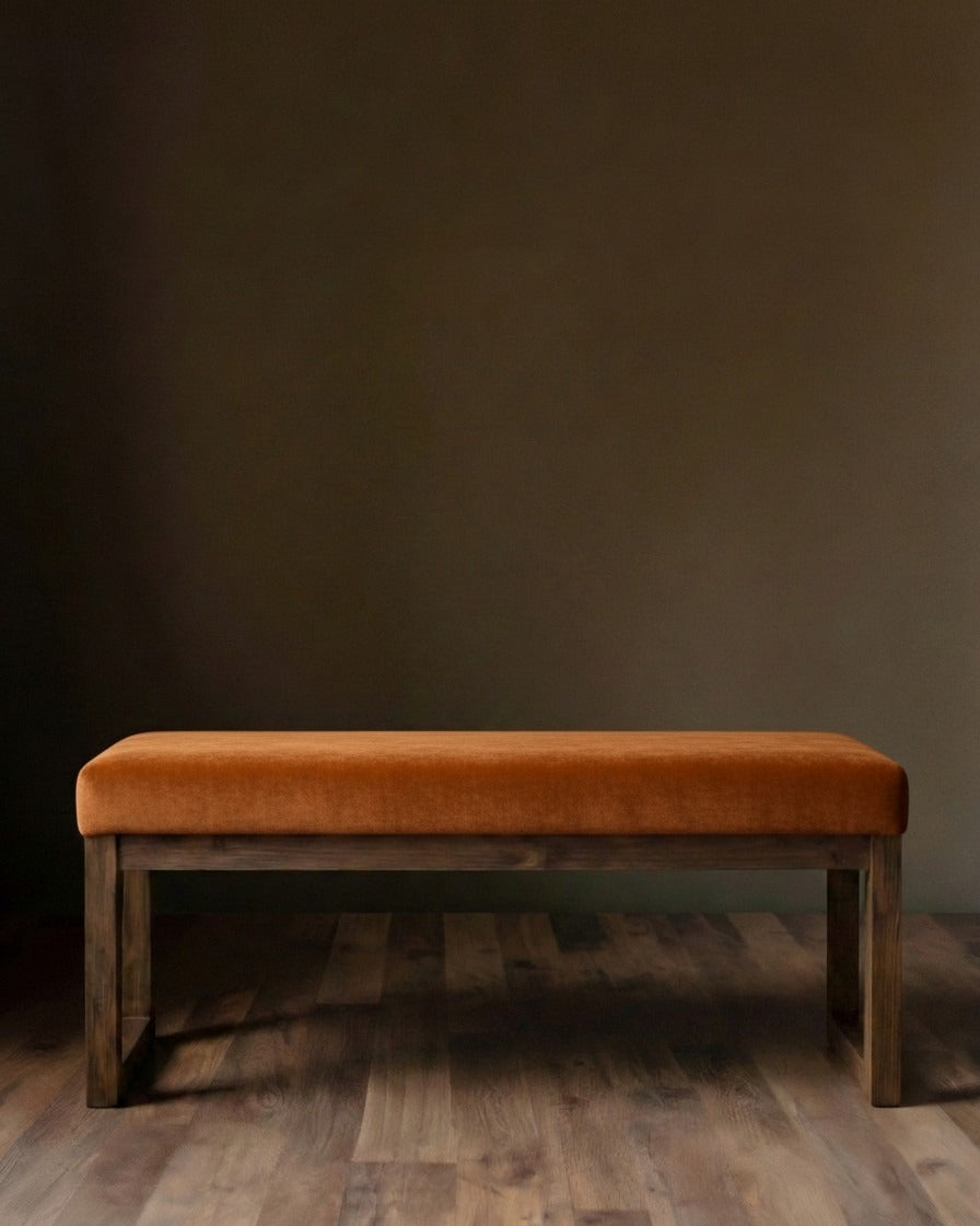 Ground your space with the perfect blend of rugged strength and vibrant comfort. This substantial bench is handcrafted from solid timber, stained in a deep, dark walnut finish that highlights the wood’s natural grain and sturdy character. Built to last for generations, the robust frame is topped with a thick, plush seat cushion. The upholstery is a high-end, richly textured woven fabric with a velvet-soft hand, featuring a warm palette of rust woven velvet. It’s an inviting statement piece designed to bring warmth and artisanal quality to your entryway, dining table, or the foot of your bed.