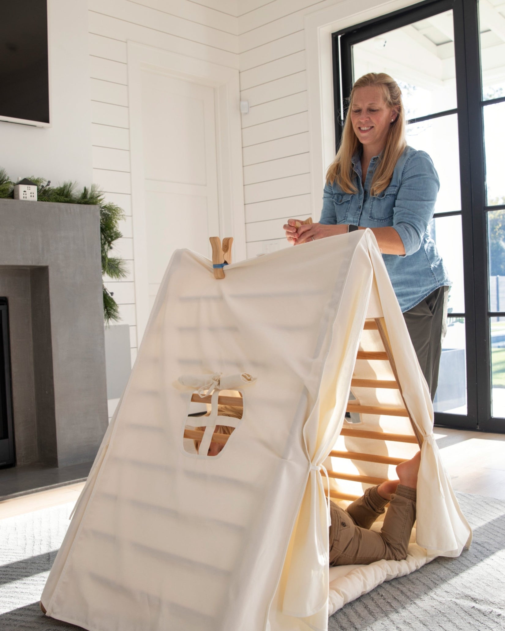 Place children in a world of imagination with this play tent! Perfect for a playroom or living room, it covers your existing Pikler Triangle and provides a space for kids to enjoy their favorite toys and stuffed animals or create their own cozy haven of blankets and pillows. Inspire little dreamers to use their imaginations and visit far-off lands, all from the comfort of home!