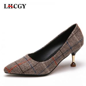 Spring Autumn Women Medium Heels Shoes Pointed Toe Dress Shoes Plaided Pumps Gold Heels Woman Boat Shoes zapatos mujer 6004