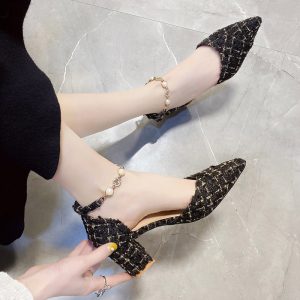 Spring Women Dress Shoes Costume Tweed Ankle Strap Sandals High Heels Pearls Pumps Pointed Toe Gold lattice sandalias 9005N