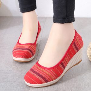 Spring Autumn Women Wedges High Heels Shoes Canvas Striped Slip on Shoes Woman Shoes Wedge Pump Ladies Shoes zapatos mujer 6163